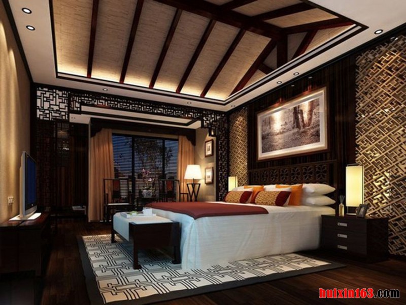卧室加之电视背景墙和古典元素和壁画的点缀,让风格的混搭与家庭年代的层次感完美结合。古典花格与绿植巧妙搭配电视柜,不落于俗,稳重气息的床大气不失品味。