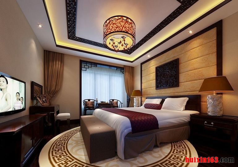卧室采用实木装饰凹位造型吊顶,实木线勾边,古风浓郁,儒雅隽美。让原本简约大方的吊顶呈现出质朴的古感,花灯式吊灯悬挂在卧室吊顶中央,在灯光的照射下,还能给人温馨祥和之感烘托出了浓厚的古典风情。