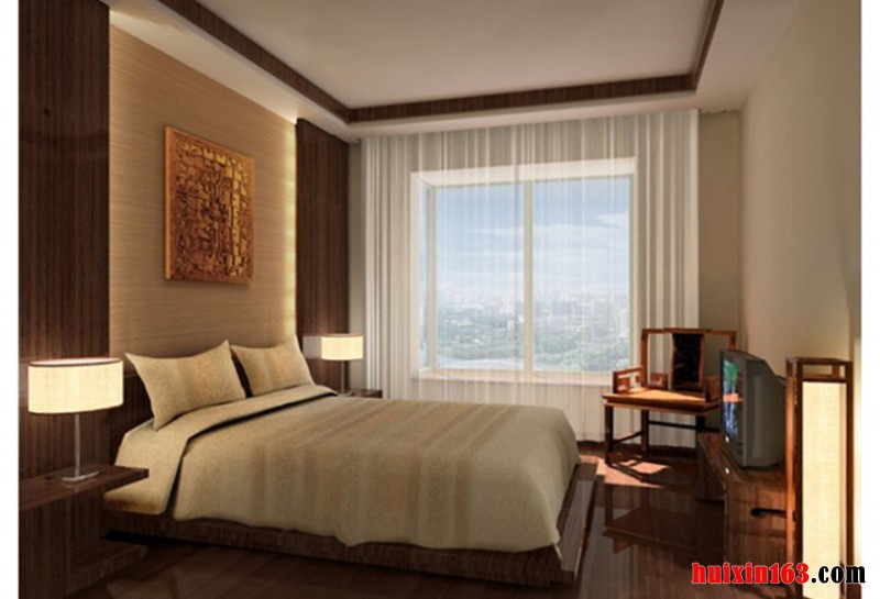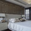 卧室以典型的古典木格栅为装饰,再配以典型的中式梅花图案为辅助,搭配中式古典家具营造中式古典风格的突出。空间把传统的结构形式通过重新设计组合以另一种民族特色的标志符号出现。