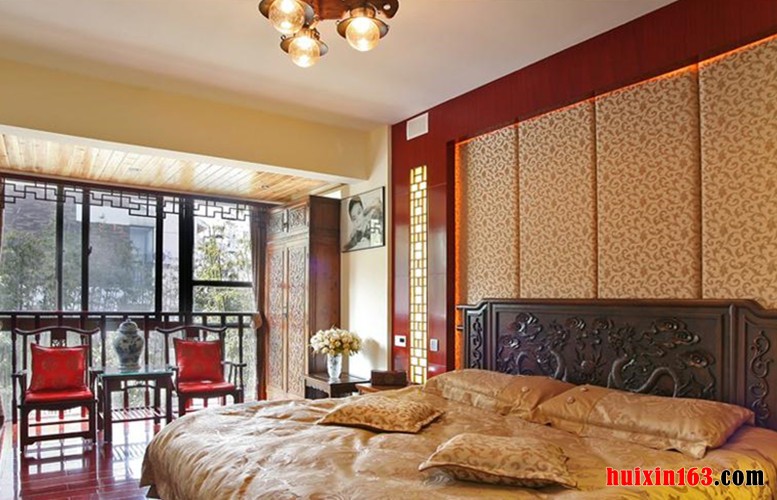 卧室以典型的古典木格栅为装饰,再配以典型的中式梅花图案为辅助,搭配中式古典家具营造中式古典风格的突出。空间把传统的结构形式通过重新设计组合以另一种民族特色的标志符号出现。
