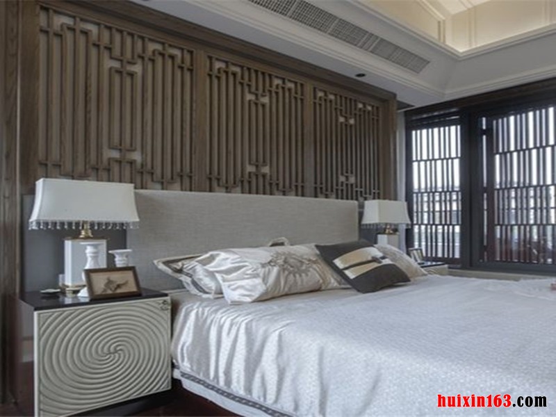 卧室以典型的古典木格栅为装饰,再配以典型的中式梅花图案为辅助,搭配中式古典家具营造中式古典风格的突出。空间把传统的结构形式通过重新设计组合以另一种民族特色的标志符号出现。
