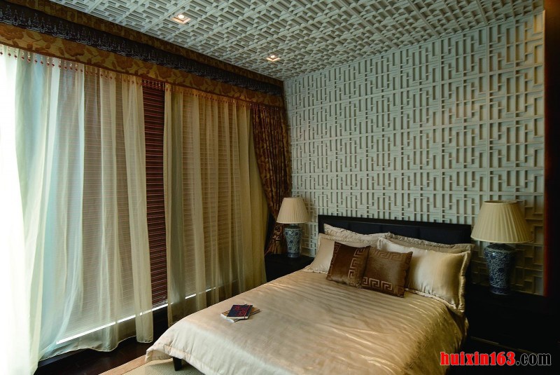 卧室以典型的古典木格栅为装饰,再配以典型的中式梅花图案为辅助,搭配中式古典家具营造中式古典风格的突出。空间把传统的结构形式通过重新设计组合以另一种民族特色的标志符号出现。