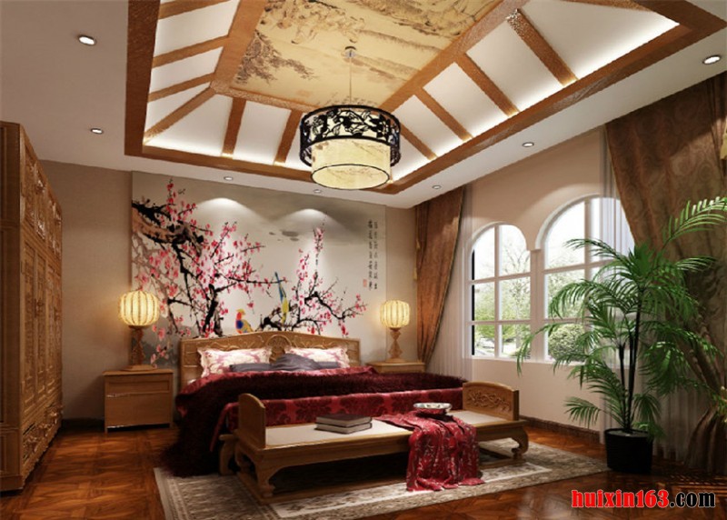 卧室以典型的古典木格栅为装饰,再配以典型的中式梅花图案为辅助,搭配中式古典家具营造中式古典风格的突出。空间把传统的结构形式通过重新设计组合以另一种民族特色的标志符号出现。