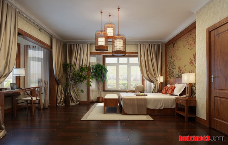 本套为古典风格装修,顶面采用石膏板进行平顶吊顶,加以吸顶灯做装饰,宽大的床,给人一种美观的感觉,卧室无论是从家具还是装饰方面都体现古典的韵味,具备了极高的融合性,空间以现代人的审美需求来打造富有传统韵味的事物。