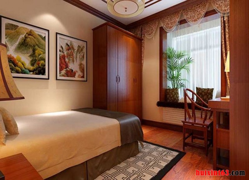 卧室的整体布局对称均衡,端正稳健,充分体现出中国传统美学精神。古典风格是在后现代建筑基础上适用于现代居住理念的中国风格,是中国传统风格文化意义在当前时代背景下的演绎,是对中国当代文化充分理解基础上的当代设计,空间让人既体会到现代设计的科技性,又体会到传统的中国韵味。
