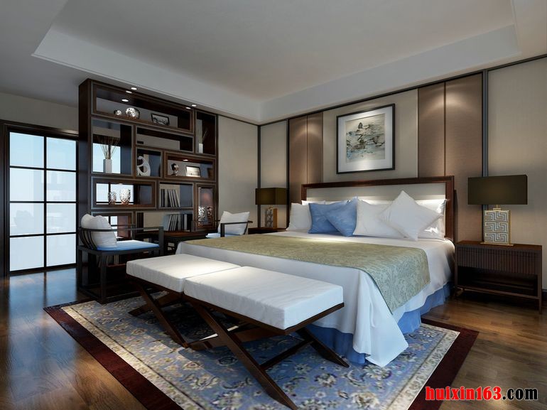 卧室的整体布局对称均衡,端正稳健,充分体现出中国传统美学精神。古典风格是在后现代建筑基础上适用于现代居住理念的中国风格,是中国传统风格文化意义在当前时代背景下的演绎,是对中国当代文化充分理解基础上的当代设计,空间让人既体会到现代设计的科技性,又体会到传统的中国韵味。