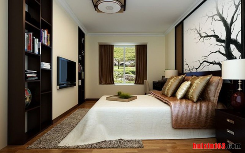 卧室简单的电视背景墙+浅色壁纸及暗红色家具。营造古典气息。空间在颜色仍然体现着古典的古朴,古典这样表现使整体空间,传统中透着现代,现代中揉着古典。古典风格的古色古香与现代风格的简单素雅自然衔接,使生活的实用性和对传统文化的追求同时得到了满足。