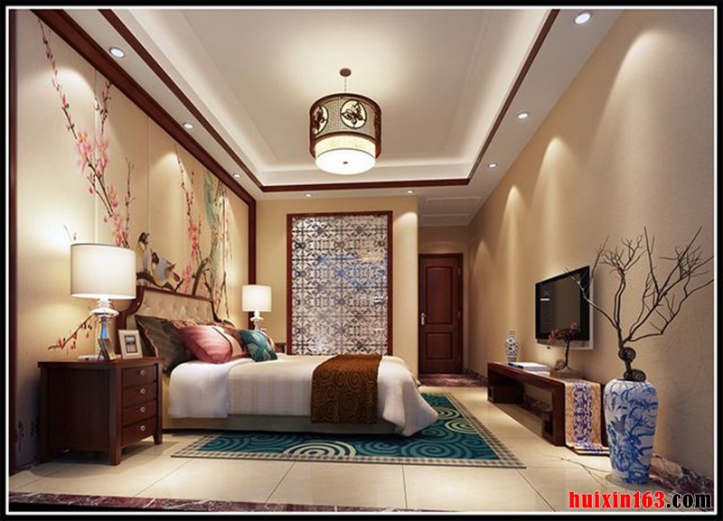 卧室的装饰整体采用了实木贯穿的装修手法,白色的石膏板吊顶设计搭配上实木的边框让空间的立体感倍增,实木的整体复古雕刻的家具搭配瞬间加深了装修品味和舒适性的存在,整体的打造突出了古典装修特点。