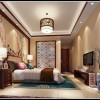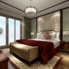 卧室营造出庄重典雅的视觉之美,色彩跳跃的壁画、灯具,造型考究的工艺品,给整体空间起到了很好的点缀。空间简约,大气,利用材质与色彩及灯光营造层次,在统一中营造变化,却又不失和谐。