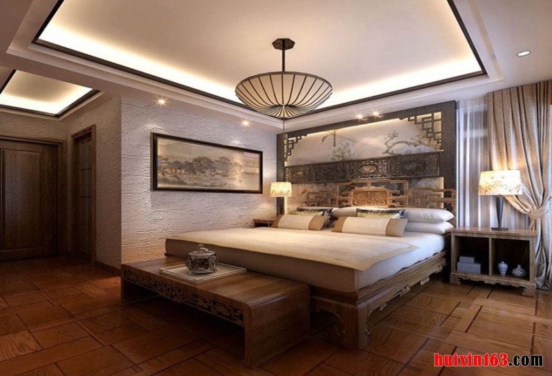 卧室的装饰整体采用了实木贯穿的装修手法,白色的石膏板吊顶设计搭配上实木的边框让空间的立体感倍增,实木的整体复古雕刻的家具搭配瞬间加深了装修品味和舒适性的存在,整体的打造突出了古典装修特点。