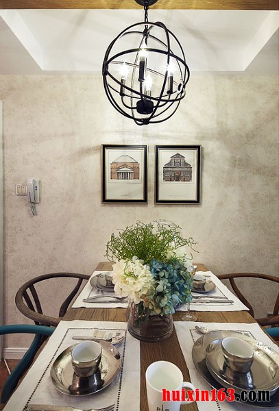 本套餐厅装饰中石膏板吊顶的设计可以带给人们一种大气感,一款黑色的铁艺吊灯低垂与餐桌上方,整体的搭配装饰效果可以带给人们一种自然的清新感,一束紫色的鲜花摆放在餐桌上更是起到了点缀的效果。