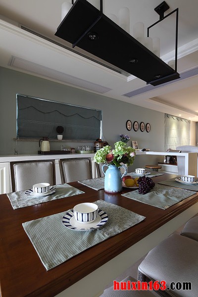 本套餐厅装饰中石膏板吊顶的设计可以带给人们一种大气感,一款黑色的铁艺吊灯低垂与餐桌上方,整体的搭配装饰效果可以带给人们一种自然的清新感,一束紫色的鲜花摆放在餐桌上更是起到了点缀的效果。