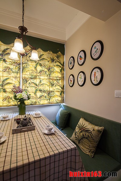 本套餐厅装饰中石膏板吊顶的设计可以带给人们一种大气感,一款黑色的铁艺吊灯低垂与餐桌上方,整体的搭配装饰效果可以带给人们一种自然的清新感,一束紫色的鲜花摆放在餐桌上更是起到了点缀的效果。