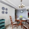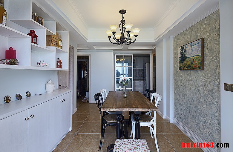 本套餐厅装饰中石膏板吊顶的设计可以带给人们一种大气感,一款黑色的铁艺吊灯低垂与餐桌上方,整体的搭配装饰效果可以带给人们一种自然的清新感,一束紫色的鲜花摆放在餐桌上更是起到了点缀的效果。