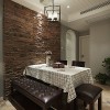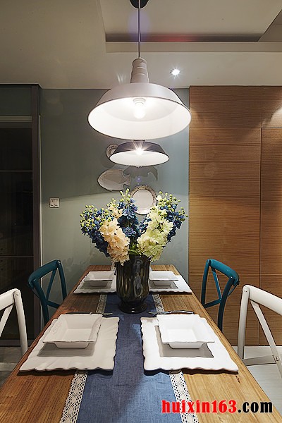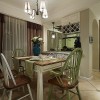 本套餐厅装饰中石膏板吊顶的设计可以带给人们一种大气感,一款黑色的铁艺吊灯低垂与餐桌上方,整体的搭配装饰效果可以带给人们一种自然的清新感,一束紫色的鲜花摆放在餐桌上更是起到了点缀的效果。