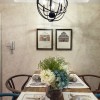 本套餐厅装饰中石膏板吊顶的设计可以带给人们一种大气感,一款黑色的铁艺吊灯低垂与餐桌上方,整体的搭配装饰效果可以带给人们一种自然的清新感,一束紫色的鲜花摆放在餐桌上更是起到了点缀的效果。