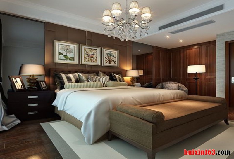 卧室的设计雍容奢华,整体的使用强调了一致性的装修风格,白色的吊顶加以大气的吊灯装饰增加了卧室的和谐气氛和温馨环境,古典风格的打造采用了现代化的装修材料有效的表现出中国传统的元素。