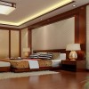 整体空间感觉更加丰富,大而不空,厚而不重,赋予空间沉稳的格调且不至使其过分压抑。局部造型顶线条与床背景墙相呼应,角花与电视背景墙相呼应,营造相互协调又层次丰富的氛围。