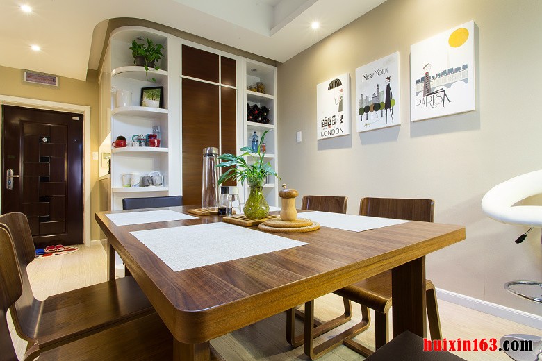 本套餐厅装饰中空间内的色调搭配可以带给人们一种华丽的感觉,平顶式的石膏板吊顶则彰显了一种大气之势,一盏金属材质的吊灯更是彰显出了一种艺术气息,更是提升了装饰的档次。