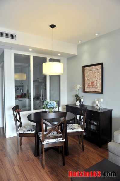 本套餐厅装饰中色调的搭配十分柔和,一款黑色的餐桌搭配了黄色带有淡淡红色花纹的布艺桌旗,整体的色调搭配以及花样图案带给人们的则是一种唯美的感受,中间艺术鲜花花瓶更是起到了点缀的效果。