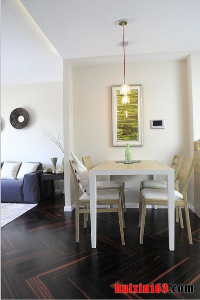 本套餐厅装饰中空间内的装饰色调主要是以黑白两色为主,平顶式的石膏板吊顶中间悬挂了一款黑色的铁艺灯饰,柔美的曲线彰显的则是一种优雅风格,一款黑色的实木餐桌上摆放了一束新鲜花束,更为餐厅装饰增添了亮点。