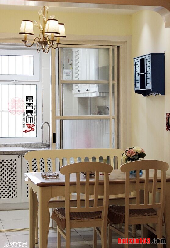 本套餐厅装饰中空间内的整体装饰色调比较柔和,一款实木餐桌上铺设了一款色彩素雅的布艺桌旗,并摆放了一款白色的瓷质花瓶,搭配上新鲜的花束更是为空间增添了一丝自然气息。