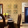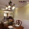本套餐厅装饰中空间内的色调搭配可以带给人们一种舒适感,石膏板吊顶采用了凹槽式的设计,在视觉上可以带给人们一种挑高的感觉,在搭配上黑色的铁艺吊灯更是彰显出了一种时尚设计感。