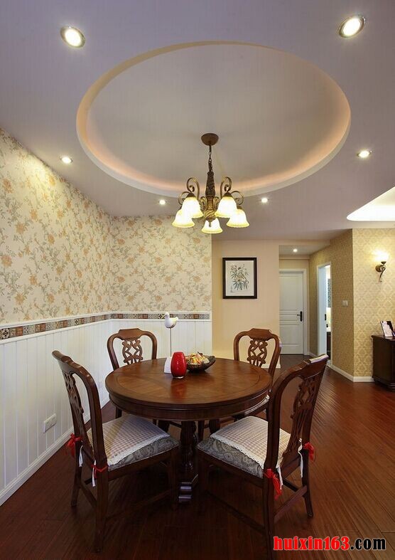 美式乡村风格主要倡导的就是“回归自然”,它是美国西部乡村的生活方式演变,至今已经成为了一种流行的居室装修风格,居室内的装饰材料主要是以天然石材以及木材为主,可以为空间营造出一种天然气息。 本套餐厅装饰中空间内的色调搭配可以带给人们一种舒适感,石膏板吊顶采用了凹槽式的设计,在视觉上可以带给人们一种挑高的感觉,在搭配上黑色的铁艺吊灯更是彰显出了一种时尚设计感。 更多»推荐家装效果图