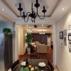 本套餐厅装饰中空间内的色调搭配可以带给人们一种舒适感,石膏板吊顶采用了凹槽式的设计,在视觉上可以带给人们一种挑高的感觉,在搭配上黑色的铁艺吊灯更是彰显出了一种时尚设计感。