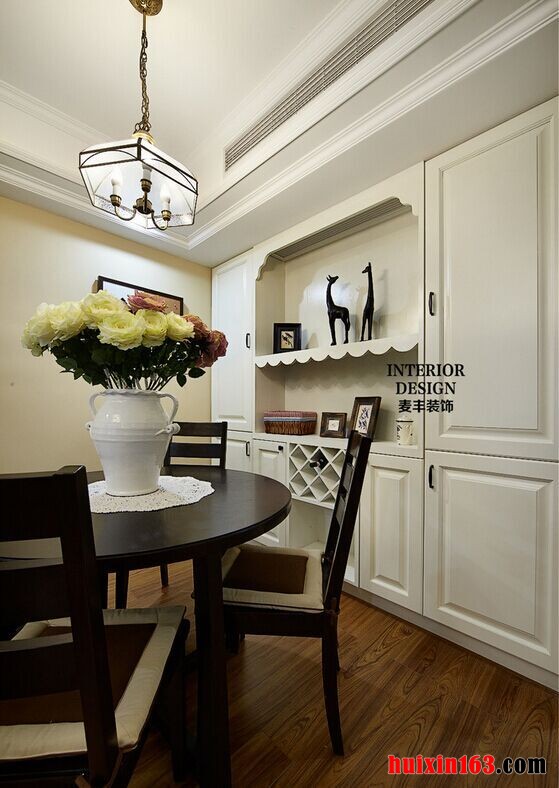 美式风格的空间装饰在色彩的搭配上主要是以自然、怀旧为主,空间内的装饰色彩多以土褐色、绿色以及暖黄色为主,空间内的线条搭配是十分简洁但并不缺乏个性,整体的装饰效果可以带给人们一定的亲切感。 本套餐厅装饰中,空间内的色彩搭配比较柔和,墙壁上粘贴了淡黄色带有条形图案的壁纸,整体的装饰效果十分流畅,虽没有华丽的装饰也没有惊艳的色彩搭配,但整体的装饰效果却并不缺乏设计感。 更多»推荐家装效果图