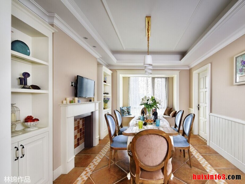 美式风格的餐厅装饰往往都是以开放式的布局为主,一般会以厨房相连,面积较大,操作起来也比较方便,同时也可以将空间的功能性全部都彰显出来,会使空间装饰显得更加通透。
