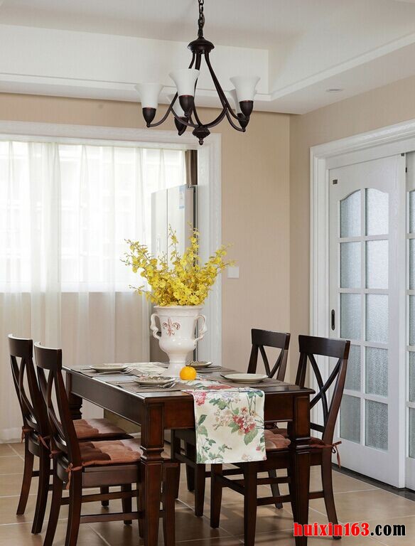 本套餐厅装饰的整体效果可以带给人们一种整洁的感觉,空间内的石膏板吊顶采用了平顶式的设计,中间悬挂了一盏金属材质的吊灯,白色的灯罩虽然没有造型装饰,但也不会带给人们单调、枯燥的感觉,反而是为空间增添了一丝时尚感。