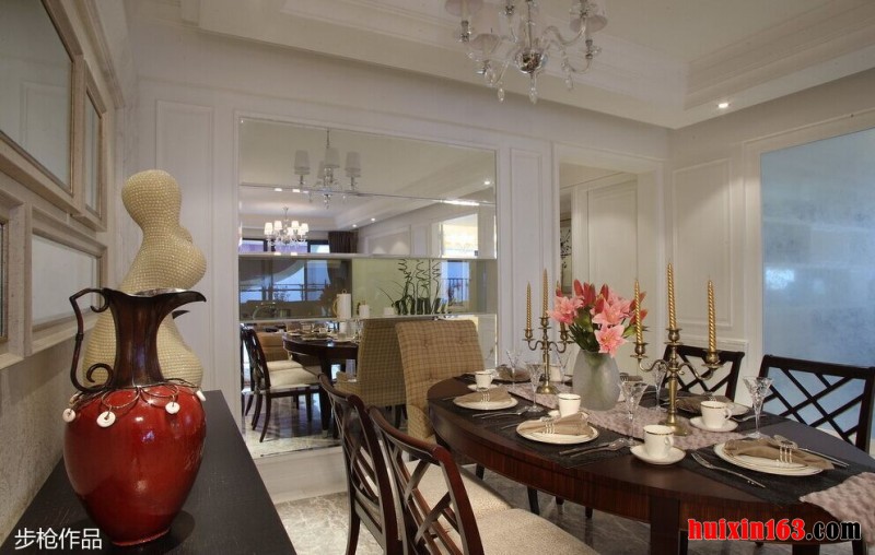 美式风格的餐厅装饰往往都是以开放式的布局为主,一般会以厨房相连,面积较大,操作起来也比较方便,同时也可以将空间的功能性全部都彰显出来,会使空间装饰显得更加通透。
