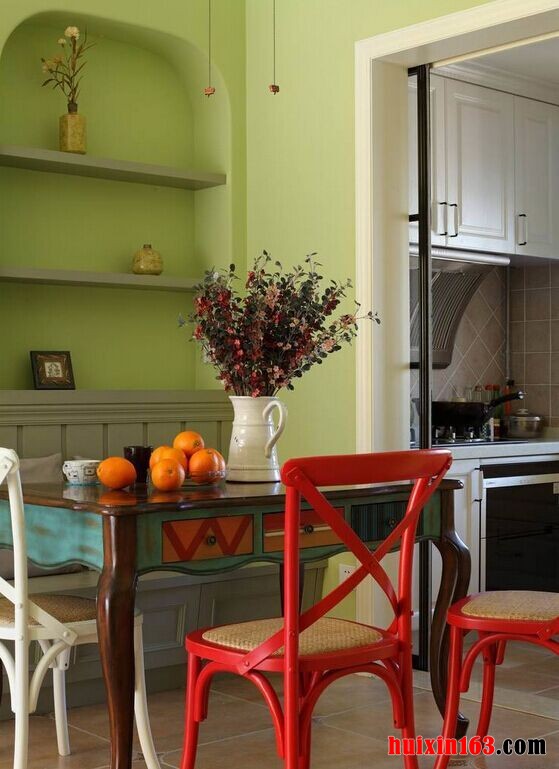 美式风格的餐厅装饰往往都是以开放式的布局为主,一般会以厨房相连,面积较大,操作起来也比较方便,同时也可以将空间的功能性全部都彰显出来,会使空间装饰显得更加通透。
