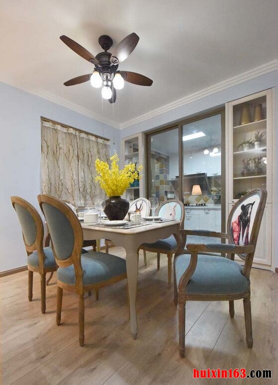 本套餐厅装饰中石膏板吊顶的设计十分具有设计感,圆形的凹槽设计中悬挂了一盏金属吊灯,将下方蓝色的餐桌衬托的更加精美,同时也凸显出了美式风格的家具特点以及装饰魅力。