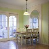 本套餐厅装饰中石膏板吊顶的设计十分具有设计感,圆形的凹槽设计中悬挂了一盏金属吊灯,将下方蓝色的餐桌衬托的更加精美,同时也凸显出了美式风格的家具特点以及装饰魅力。