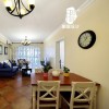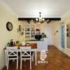 本套餐厅装饰中石膏板吊顶的设计十分具有设计感,圆形的凹槽设计中悬挂了一盏金属吊灯,将下方蓝色的餐桌衬托的更加精美,同时也凸显出了美式风格的家具特点以及装饰魅力。
