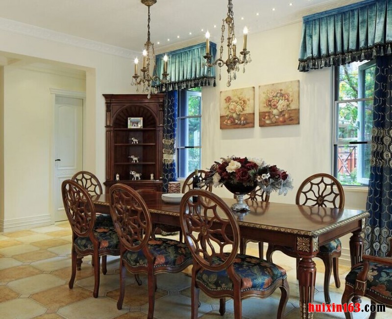 布艺是美式田园风格中非常重要的一种装饰物品,一般都是以棉麻为主,天然的质感与美式田园风格搭配在一起是十分协调的,如果可以添加一些碎花或是格子图案则更能将异域风情彰显出来。 本套餐厅装饰可以带给人们一种强烈的古典气息,空间内的石膏板吊顶采用了平顶式的设计,并在中间悬挂了一盏黄底带有彩绘图案的古典灯饰,下方的实木餐桌上搭配了一款素雅的桌布,为整个餐厅装饰增添了美感。 更多»推荐家装效果图