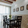 本套餐厅装饰可以带给人们一种强烈的古典气息,空间内的石膏板吊顶采用了平顶式的设计,并在中间悬挂了一盏黄底带有彩绘图案的古典灯饰,下方的实木餐桌上搭配了一款素雅的桌布,为整个餐厅装饰增添了美感。