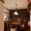 本套餐厅装饰可以带给人们一种强烈的古典气息,空间内的石膏板吊顶采用了平顶式的设计,并在中间悬挂了一盏黄底带有彩绘图案的古典灯饰,下方的实木餐桌上搭配了一款素雅的桌布,为整个餐厅装饰增添了美感。