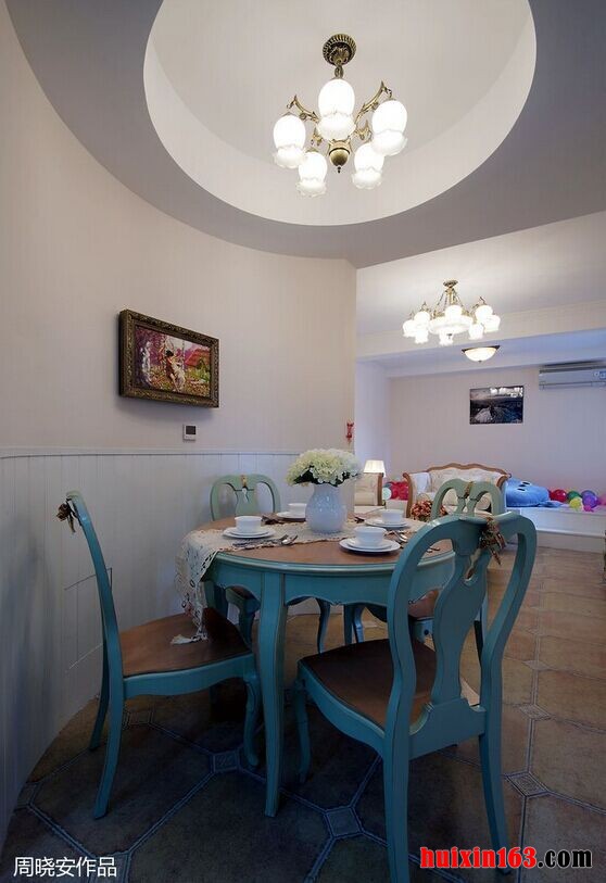 本套餐厅装饰可以带给人们一种大气的感觉,石膏板吊顶上做了精致的造型设计,可以将中间的铁艺吊灯凸显的更加富有个性,下方的实木餐桌搭配上蓝色的座椅,更是一种惊艳的搭配,可以令人过目不忘。