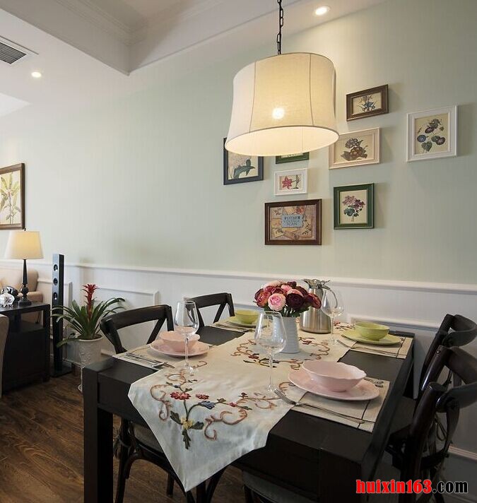 本套餐厅装饰十分简洁,空间内没有繁杂的造型设计也没有华丽的色彩点缀,朴素的设计却也并不缺乏设计感,平顶式的石膏板吊顶中间悬挂了一盏精致却略显单薄的装饰灯饰,为整个餐厅装饰都增添了亮点。