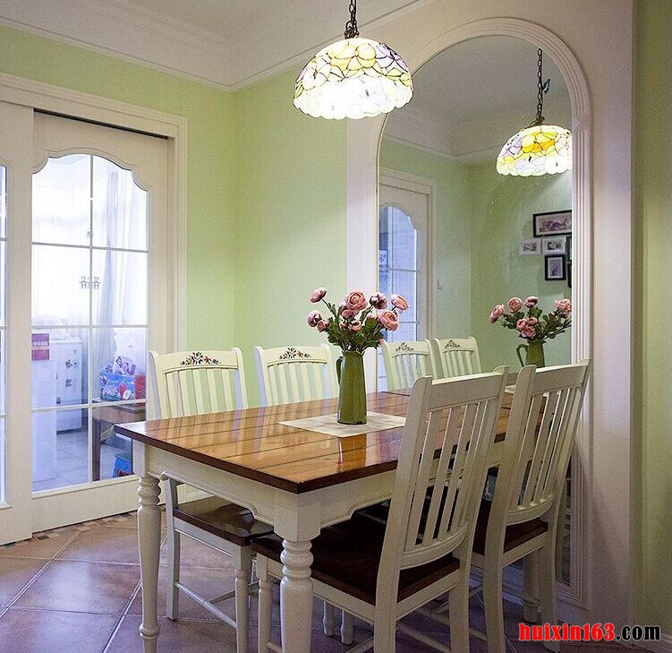 本套餐厅装饰十分简洁,空间内没有繁杂的造型设计也没有华丽的色彩点缀,朴素的设计却也并不缺乏设计感,平顶式的石膏板吊顶中间悬挂了一盏精致却略显单薄的装饰灯饰,为整个餐厅装饰都增添了亮点。
