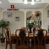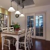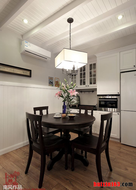 美式田园风格的装饰并没有欧式风格那样注重华丽与高贵,美式风格带给我们更多的感受是自由,无论是空间内的格局搭配还是装饰物品的选择都不会有固定的形式,它所展现给我们的就是一种自由与无拘无束。 白色的空间内黑色的实木餐桌以及座椅便会显得更加显眼,这也是凸显时尚设计的一种搭配手法,石膏板吊顶上的设计比较简单,但并不会带给人们厌烦感,搭配上一款造型简洁的灯饰更是可以将美式风格的魅力彰显出来。 更多»推荐家装效果图