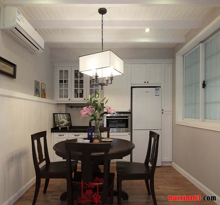 白色的空间内黑色的实木餐桌以及座椅便会显得更加显眼,这也是凸显时尚设计的一种搭配手法,石膏板吊顶上的设计比较简单,但并不会带给人们厌烦感,搭配上一款造型简洁的灯饰更是可以将美式风格的魅力彰显出来。