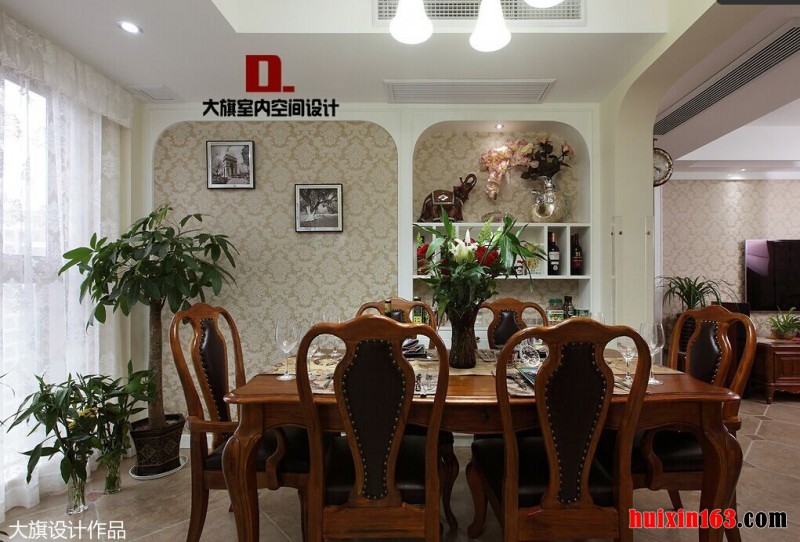 美式田园风格的装饰并没有欧式风格那样注重华丽与高贵,美式风格带给我们更多的感受是自由,无论是空间内的格局搭配还是装饰物品的选择都不会有固定的形式,它所展现给我们的就是一种自由与无拘无束。 白色的空间内黑色的实木餐桌以及座椅便会显得更加显眼,这也是凸显时尚设计的一种搭配手法,石膏板吊顶上的设计比较简单,但并不会带给人们厌烦感,搭配上一款造型简洁的灯饰更是可以将美式风格的魅力彰显出来。 更多»推荐家装效果图