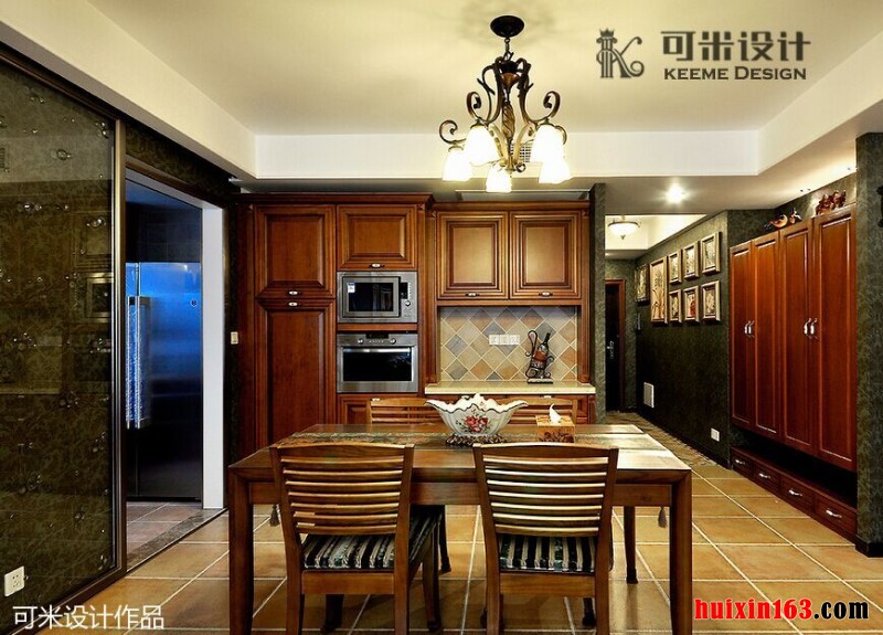 本套空间内美式风格的装饰设计展现的比较明显,石膏板吊顶采用了平顶式的设计,可以将中间黑色的铁艺吊灯衬托的更加别致买也可以凸显出独特的美感,下方的实木餐桌虽然会为空间带来一丝古典气息,但整体的设计与搭配并不会使人们觉得压抑。