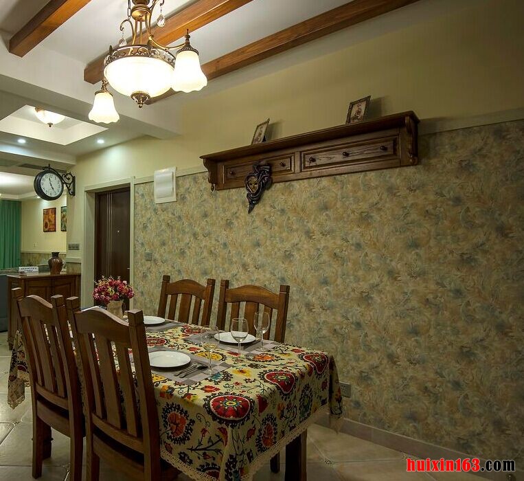 本套空间内美式风格的装饰设计展现的比较明显,石膏板吊顶采用了平顶式的设计,可以将中间黑色的铁艺吊灯衬托的更加别致买也可以凸显出独特的美感,下方的实木餐桌虽然会为空间带来一丝古典气息,但整体的设计与搭配并不会使人们觉得压抑。