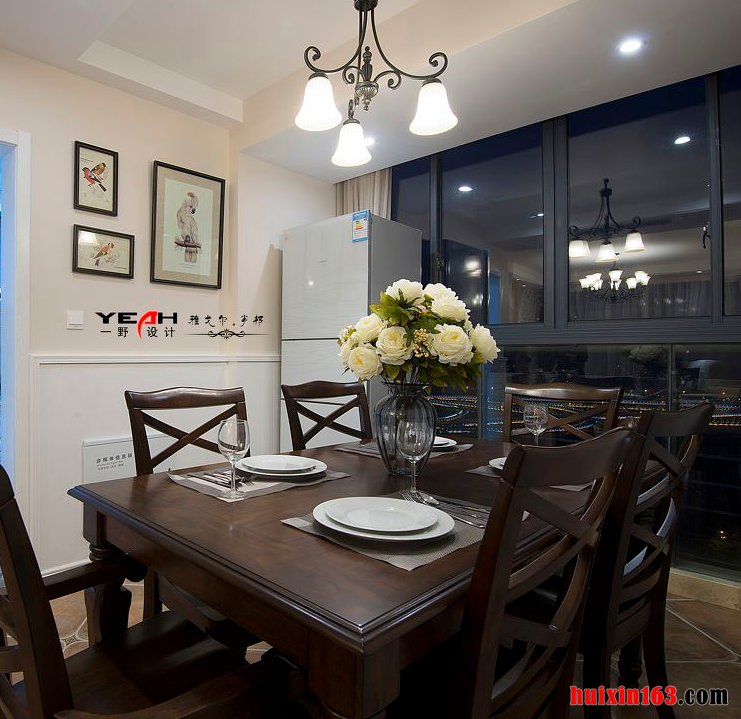 本套空间内美式风格的装饰设计展现的比较明显,石膏板吊顶采用了平顶式的设计,可以将中间黑色的铁艺吊灯衬托的更加别致买也可以凸显出独特的美感,下方的实木餐桌虽然会为空间带来一丝古典气息,但整体的设计与搭配并不会使人们觉得压抑。