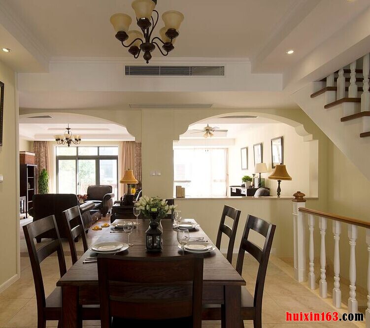 本套空间内美式风格的装饰设计展现的比较明显,石膏板吊顶采用了平顶式的设计,可以将中间黑色的铁艺吊灯衬托的更加别致买也可以凸显出独特的美感,下方的实木餐桌虽然会为空间带来一丝古典气息,但整体的设计与搭配并不会使人们觉得压抑。